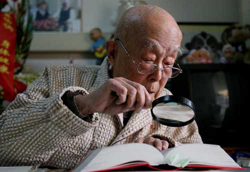 标题:上了年纪的季老用放大镜看书