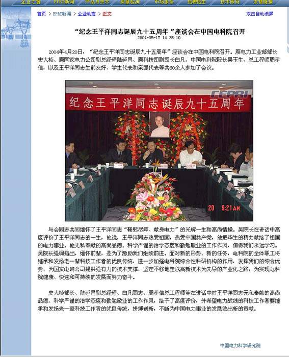 点击浏览详图 (相册号:61748) | | 标题:电科院网站关于纪念会的报导 | | 说明:王平洋诞辰95周年暨逝世一周年纪念会召开 |