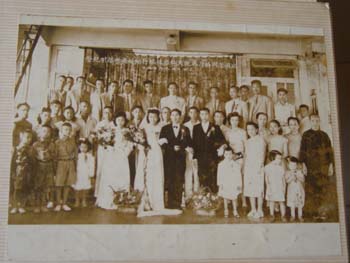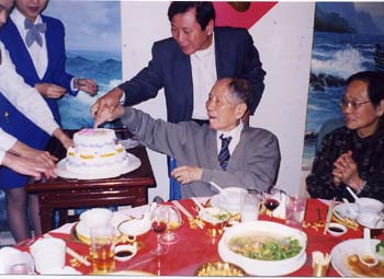 说明:盛老在切生日蛋糕,右一为夫人薛月英,站立者为儿子盛云鹤