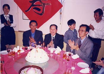 标题:在盛老生日晚宴上与福建中医学院领导(右一)及厦大海外教育学院领导(左一)合影
