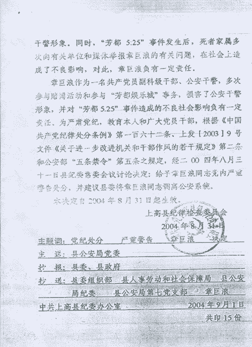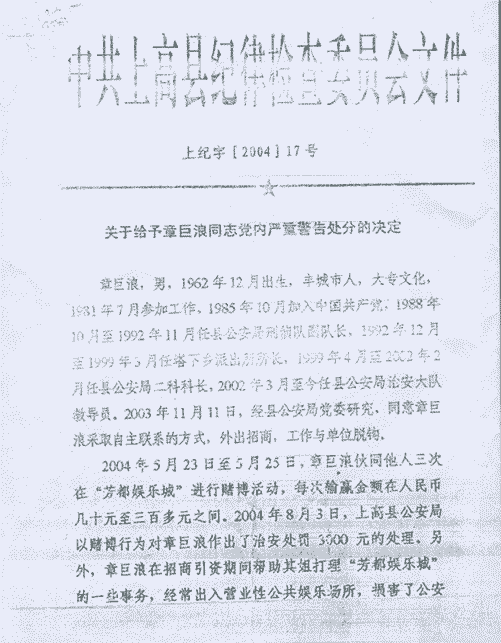 关于给予章巨浪同志党内严重警告处分的决定2