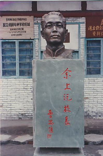 说明:1991年4月30日,在余上沅校长逝世21周年之际,在江安国立剧专旧址,由海内外160余位剧专校友捐资铸造的余上沅先生铜像落成,曹禺先生为铜像基座题字。