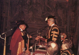 点击浏览详图 (相册号:8476) | | 标题:接受名誉博士学位。 | | 说明:1987年接受英国伦敦市立大学名誉博士学位。 |