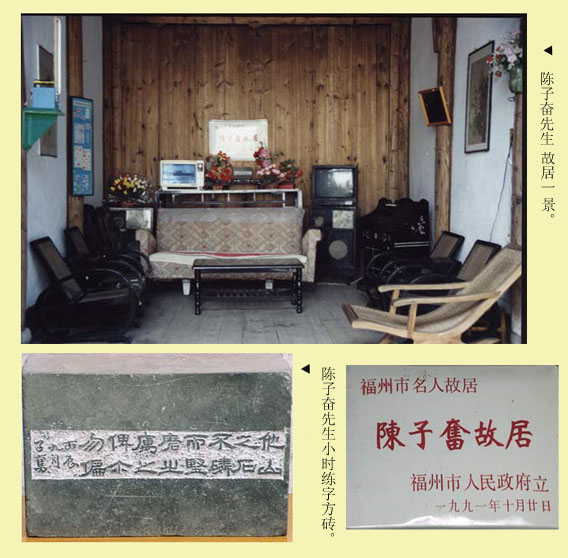 点击浏览详图 (相册号:9578) | 标题:陈子奋先生故居。 | 说明:陈子奋先生故居于福州鼓楼区道山路(月香弄)235号,背倚乌石山,屋后一石,状如灵芝,上有古人题刻“芝石”二字。屋为二进砖木结构,拱门小厅,风格古雅。庭中莳花种草,桂花清香四溢。子奋自名其居为“芝石山斋”、“桂香书屋”、“乌石山斋”等。大厅左右悬挂两张陈子奋先生的白描双钩遗作,正中横桌上陈列子奋小时练字用的方砖,上刻“他山之石,不璘而坚,磨之厉之这,俾乐勿偏。丙辰九月子奋”的字样。(注:丙辰即1916年此时陈子奋先生年方18岁。)