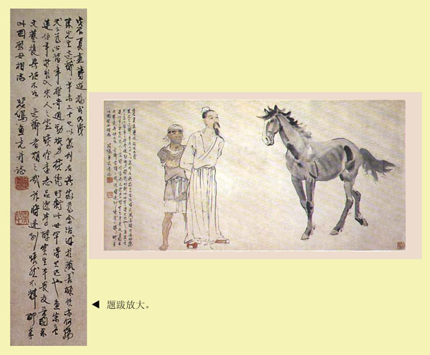 点击浏览详图 (相册号:9579) | 标题:国画大师徐悲鸿绘赠陈子奋先生《九方皋相马图》并题跋。 | 说明:圖中左有題跋“戊辰夏盡,薄遊福州。乃識陳先生意薌,年未三十,已以篆刊名其家。爲余治‘遊於藝’、‘長顑頷亦何傷’。‘天下爲公’諸章,雄奇道勁,腕力橫絕,盱衡此世,罕得其匹也;畫宗老蓮伯年,漸欲人宋人之室,曠懷遠志,品潔學醇,實生平畏友。吾國果文藝復興,詎不如意薌者,期之哉,茲將遠別,悵然不釋,聊奉此圖,願毋相忘。悲鴻畫竟並誌。”鈴印朱文一方“困而知之”,白文一方作“徐悲鴻印”。(戊辰即1928年)