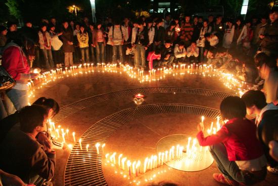 点击浏览详图 (相册号:91419) | | 标题:学生用蜡烛拼出心形表达祝福 | 说明:2008年5月14日晚22点,吉林大学南校区的大学生们自发集合,共同点燃蜡烛,然后摆成心型,为四川汶川地震灾民祈福。