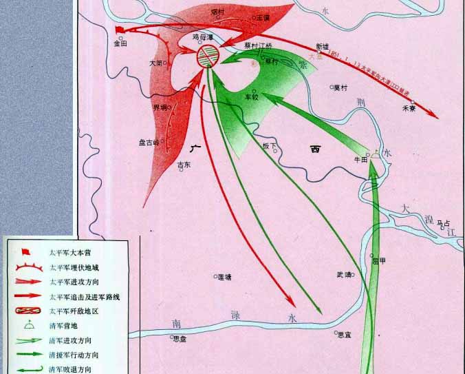 点击浏览详图 (相册号:24826) | | 标题:“蔡村江之战”形势图 | | 说明:1850年1月1日,清军分兵数路,对金田发动大规模围剿,太平军在金田至蔡村一带设伏,大败进犯清军,清军主帅伊克坦步及数名将领身亡。 |
