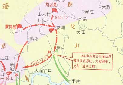 点击浏览详图 (相册号:24825) | | 标题:“迎主之战”形势图 | | 说明:1850年12月25日,主持金田军务的杨秀清,韦昌辉,石达开自金田总部发兵,奇袭平南思旺,大败清军,使被困于鹏化花洲的洪秀全冯云山顺利回到金田,拜上帝会自此也移至金田,史称“迎主之战”。 |