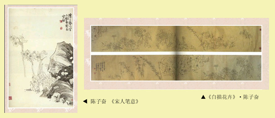 《白描花卉》高32.5厘米 宽341.5厘米 纸本白描年代:1953年款识:癸巳五月望 意芗陈子奋仿宋人钩勒於福州之月香画屋。钤印:陈子奋印(白文)