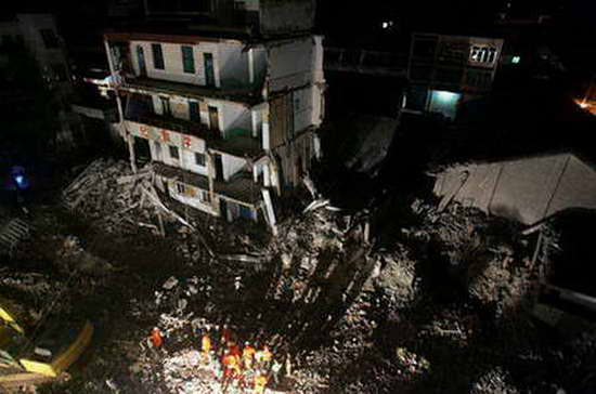 5月13日凌晨拍摄的四川绵竹市垮塌的房屋。