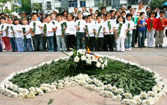 5月19日下午,苏州市石路街道的孩子们在用白菊花搭成的心形花圈旁,共同为汶川大地震遇难同胞默哀。
